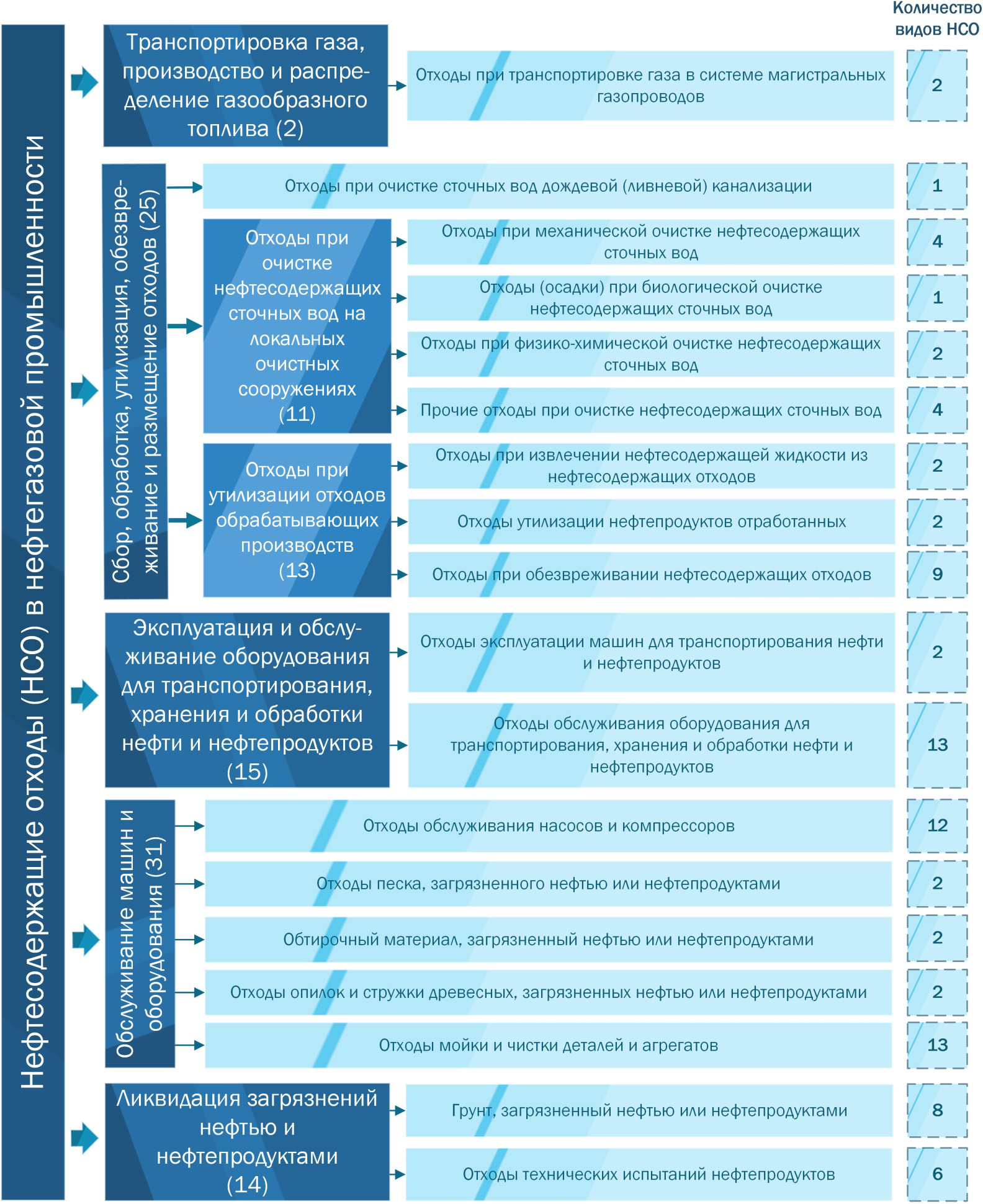 Подходы к классификации НСО по различным признакам широко представлены в литературных источниках [19–24], однако в них не в полном объеме учитываются источники образования отходов в соответствии с Федеральным классификационным каталогом отходов (ФККО) [25]. По данным ФККО, в 2024 году насчитывается 367 видов НСО во всех сферах производства и потребления, в том числе 173 вида отходов в нефтегазовой промышленности, классификация которых показана на рис. 1 и 2.