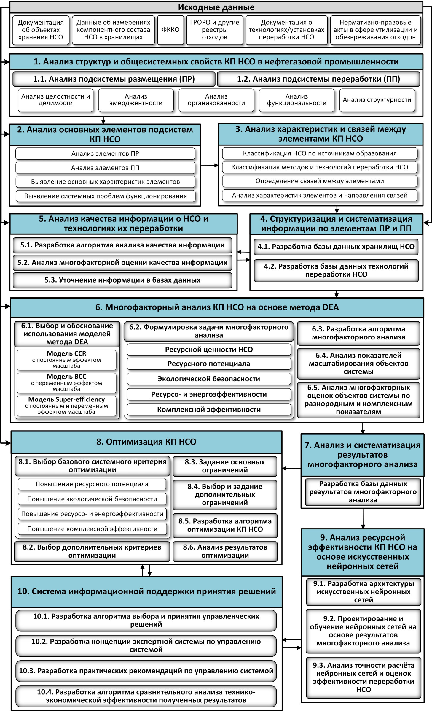 В работе предложена и описана новая методика системного анализа КП НСО на основе метода DEA. Описаны и представлены классификации НСО по источникам образования в нефтегазовой промышленности и методам переработки НСО. Приводится анализ основных системных проблем, присущих различным технологиям переработки отходов. Рассмотрены взаимосвязи элементов комплекса переработки, выявлены общесистемные свойства и закономерности, подтверждающие обоснованность подхода к исследованию КП НСО с позиций теории системного анализа.