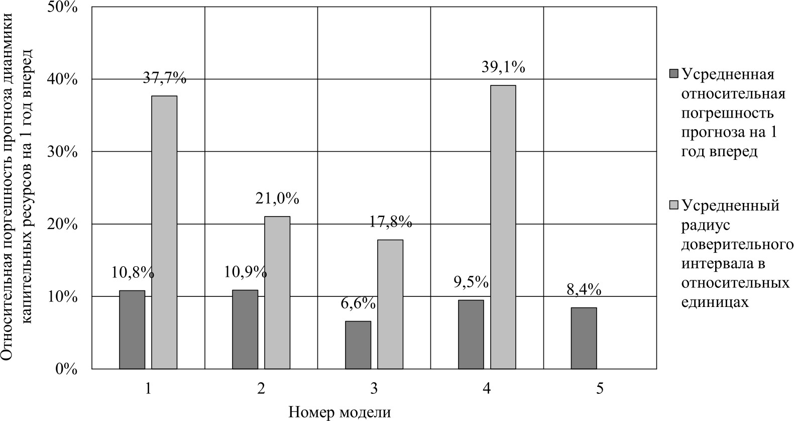 Рис. 1. Сравнительный анализ усредненных значений относительных погрешностей прогнозов и усредненных радиусов доверительных интервалов для моделей (2)–(5)