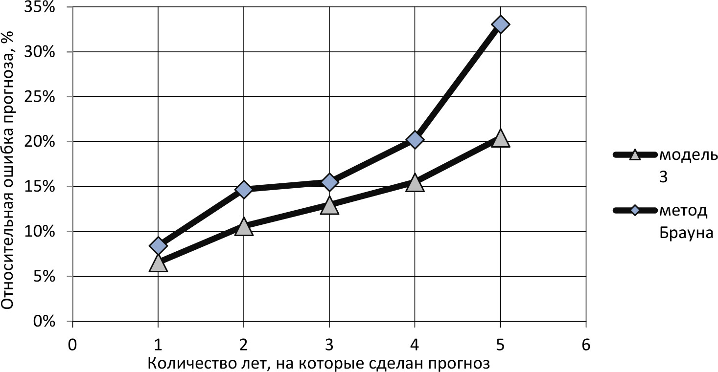 На рис. 2 продемонстрированы усредненные значения погрешностей прогнозов динамики капитальных ресурсов, рассчитанные по модели 3 и методу экспоненциального сглаживания Брауна.