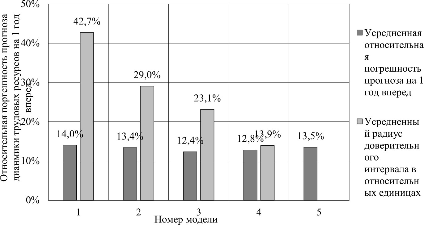 Таблица 4. Погрешности прогноза динамики трудовых ресурсов, сделанного на основе исследуемых математических моделей, %