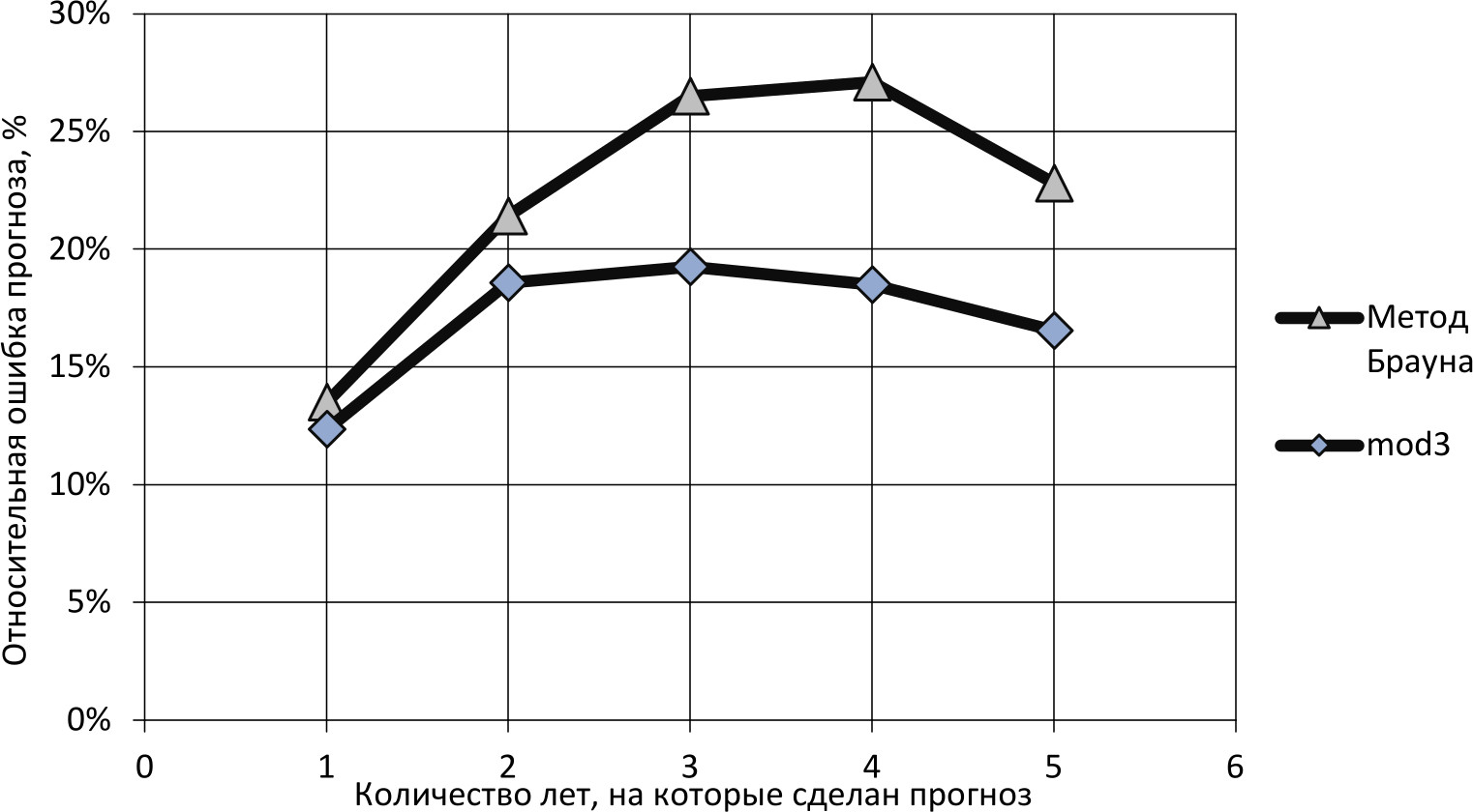 Рис. 2. Значения усредненных погрешностей ретроспективных прогнозов динамики капитальных ресурсов, рассчитанные по модели 3 (формула 4) и методом Брауна