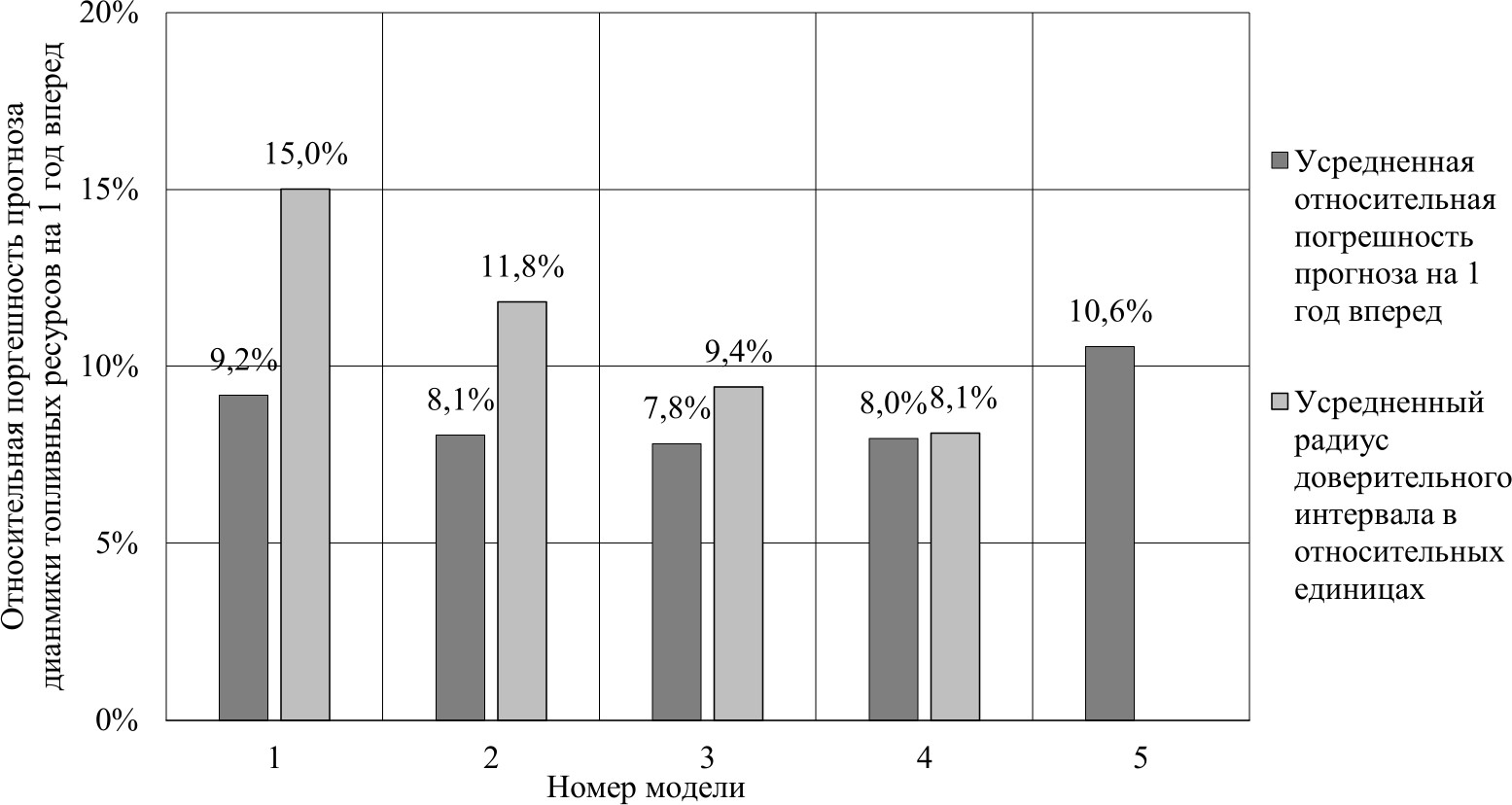 С целью окончательного выбора наилучшей математической модели для описания динамики топливных ресурсов также была проведена оценка погрешностей ретроспективных прогнозов по данным 20 лет на 1 год вперед. Усредненные значения относительных погрешностей прогнозов и усредненные радиусы доверительных интервалов в относительных единицах графически отображены на рис. 5 в сравнении с методом Брауна (модель под номером 5).