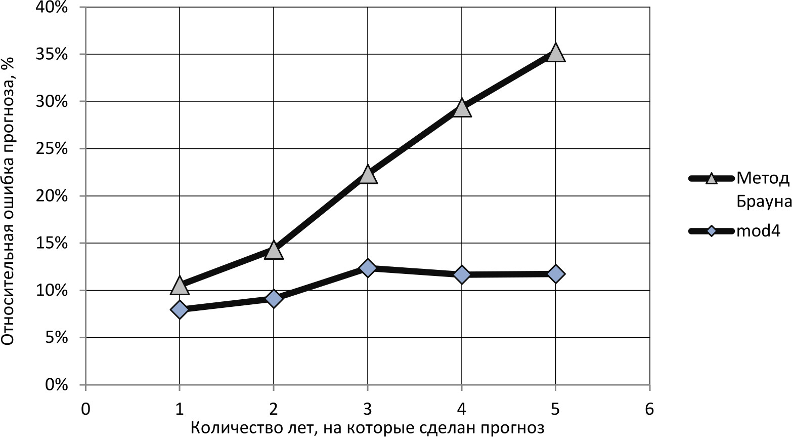 Рис. 6. Значения усредненных погрешностей ретроспективных прогнозов динамики топливных ресурсов, рассчитанные по модели 4 (формула 7) и методом Брауна