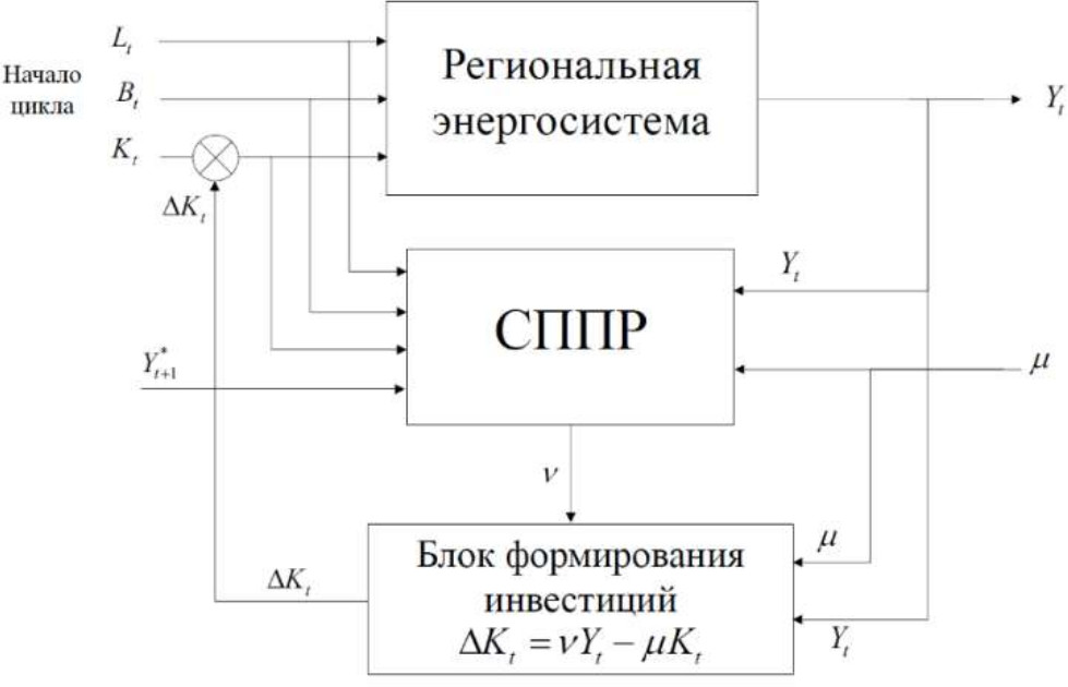 В контуре управления энергосистемой моделируется формирование инвестиций на обновление капитальных ресурсов Kt+1 за счет доли прибыли от выпуска продукции Yt с помощью управляющей величины v.
