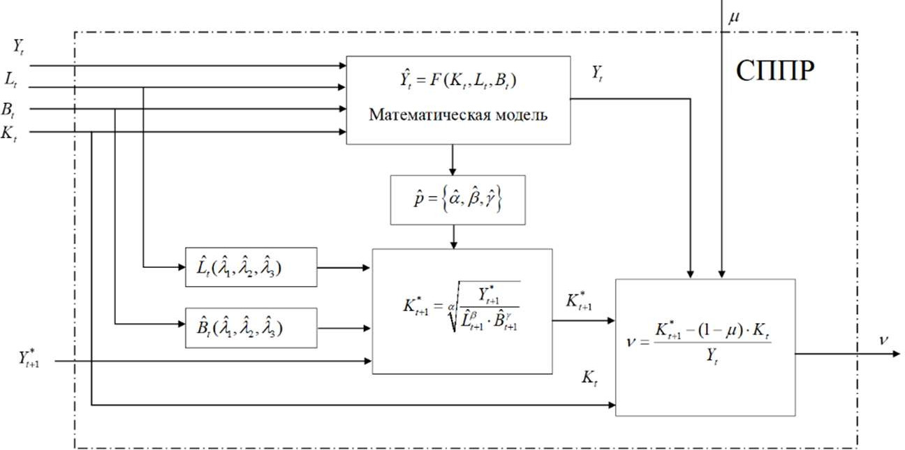 Для формирования математически оправданных решений при определении величины инвестиций в обновление капитальных ресурсов на будущий год в контуре имитационной модели была использована система поддержки принятия решений (СППР), структура которой приведена на рис. 8.