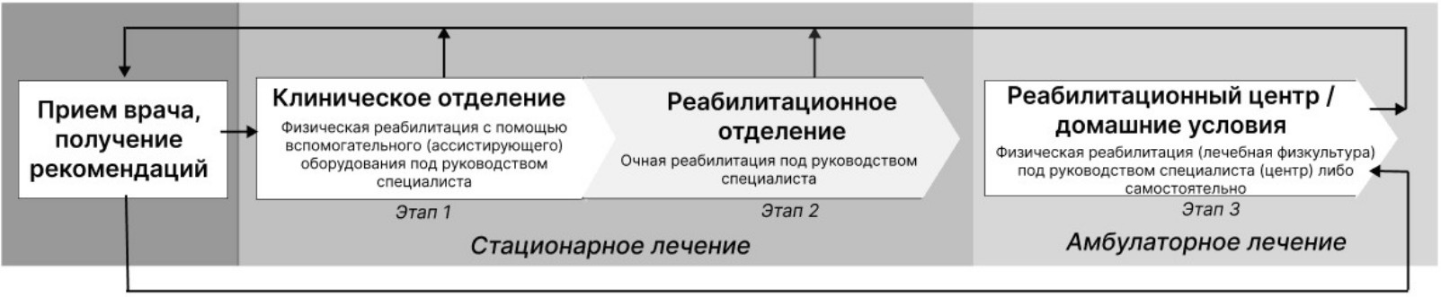 Процесс функциональной реабилитации включает несколько периодов, разделенных на этапы, которые для достижения адекватного результата должны следовать друг за другом непрерывно (рис. 2). Подходы на выделяемых этапах, как правило, носят как стационарный, так и амбулаторный характер. Под функциональной реабилитацией далее будем понимать лечебную физкультуру как наиболее доступный из методов функциональной реабилитации с доказанной эффективностью [11].