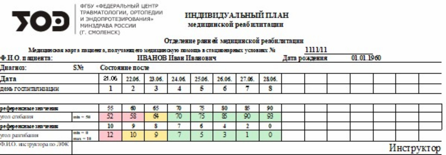 Для отслеживания процесса восстановления пациента используется цветное кодирование, присваивающее полученному измерению угла сгибания прооперированного сустава в соответствии с его отклонением от референсных значений, указанных в графике реабилитации, цветовой код: