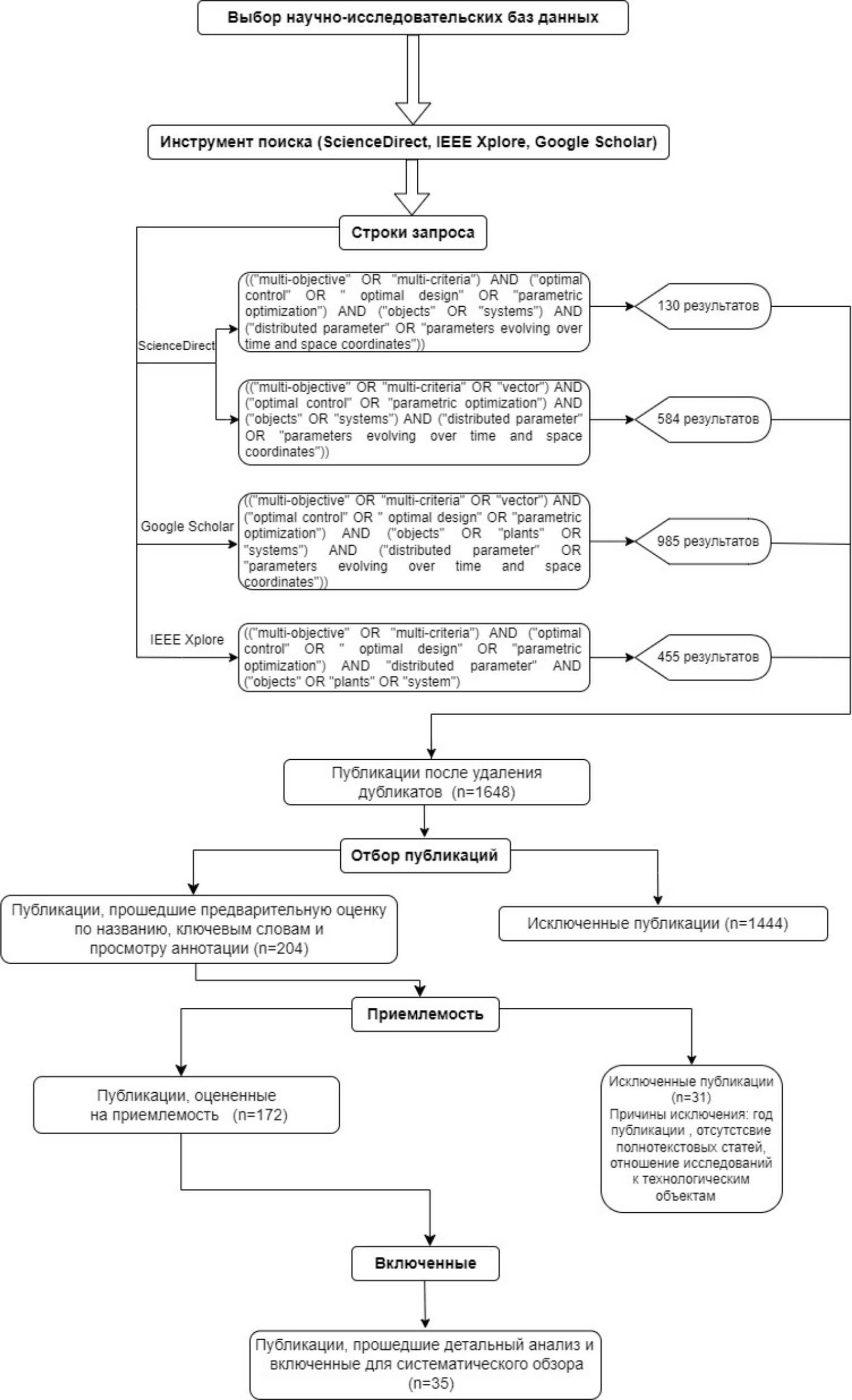 В соответствии с рекомендациями PRISMA для поиска статей в выбранных базах данных необходимо сформулировать набор ключевых слов, которые являются основополагающими при составлении выборки публикаций и определяют стратегию исследования. Ключевые слова, лежащие в основе поиска, должны быть достаточно общими, чтобы гарантировать, что ни одна статья, представляющая интерес, не будет пропущена. Однако чтобы избежать чрезмерной обобщенности и повысить точность поиска, для большинства ключевых слов использовались также их синонимы с учетом возможных альтернативных вариантов. Например, для термина «многокритериальная оптимизация» использовались ключевые слова multi-objective (многоцелевая), multi-criteria (многокритериальная) и vector (векторная) оптимизация. Для определения типа задач использовались ключевые слова: optimal control (оптимальное управление), optimal design (оптимальное проектирование), parameter optimization (параметрическая оптимизация). Для выделения объектов и систем (object (объект), system (система)), функция состояния которых зависит не только от времени, но и от пространственных координат, использовались ключевые слова distributed parameters (распределенные параметры), parameters evolving over time and space coordinates (параметры, изменяющиеся во времени и пространственных координатах).