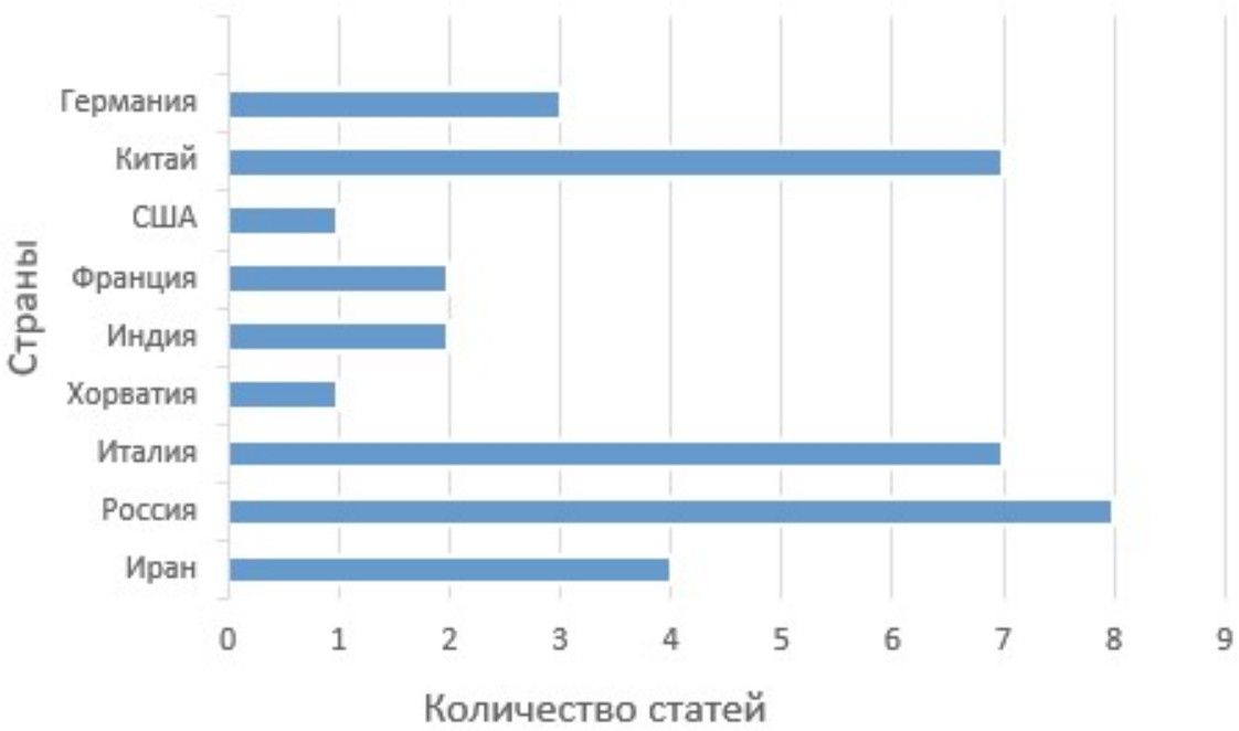 На рис. 4 представлено распределение по странам отобранных для исследования публикаций в период 2013–2023 гг. Гистограмма, позволяющая оценить географическую локализацию исследований, показывает, что наиболее активно исследования в области многокритериальной оптимизации технологических объектов проводили такие страны, как Китай, Италия, Иран и Россия.
