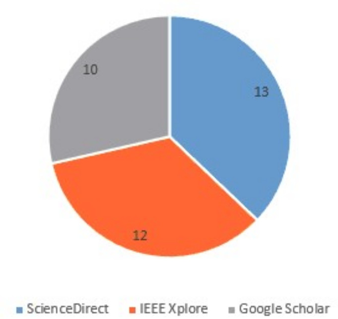 На рис. 5 представлена круговая диаграмма, демонстрирующая распределение отобранных исследований по трем базам данных: ScienceDirect, IEEE Xplore и Google Scholar. Каждый сектор диаграммы соответствует количеству исследований, отобранных из соответствующей базы данных для проведения систематического обзора. Из рисунка видно, что распределение публикаций по базам данных можно считать практически равномерным.