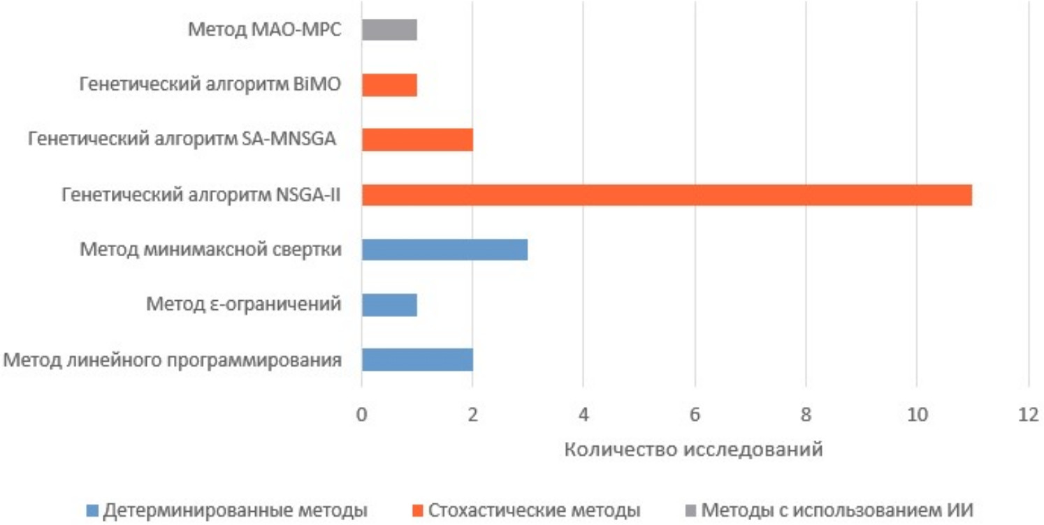 В рамках проведенного систематического обзора были выделены три основные тенденции в подходах к решению задач многокритериальной оптимизации: детерминированные, стохастические методы и методы с использованием ИИ. Частота использования методов и алгоритмов многокритериальной оптимизации может быть проанализирована с помощью диаграммы (рис. 6). Согласно проведенному систематическому обзору, из общего числа отобранных исследований: