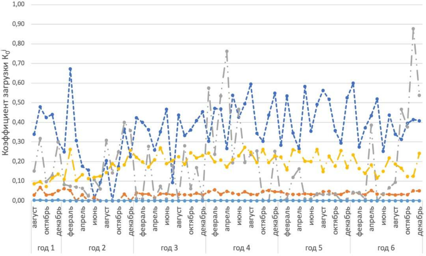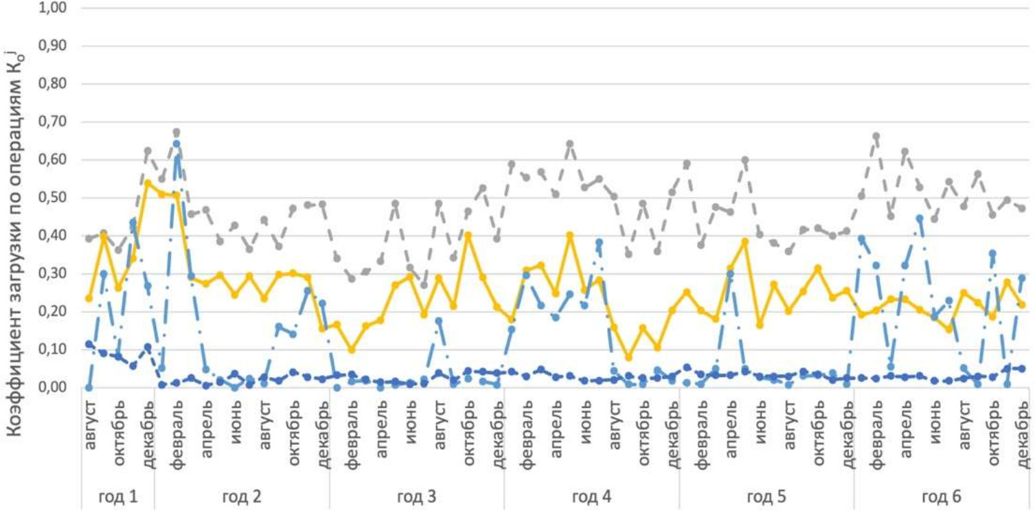 Рис. 4. Коэффициент загрузки оборудования по операциям : ▬●▬− – никелирование; ▬●▬ − – хроммолибденирование; ▬●▬ − – снятие специального слоя и нагара; ▬●▬ − – химическое фосфатирование с оксидированием в универсальной гидрофобизирующей жидкости; ▬●▬ − – снятие краски