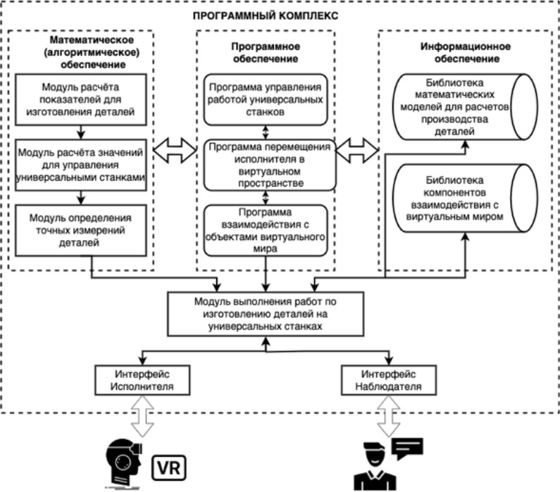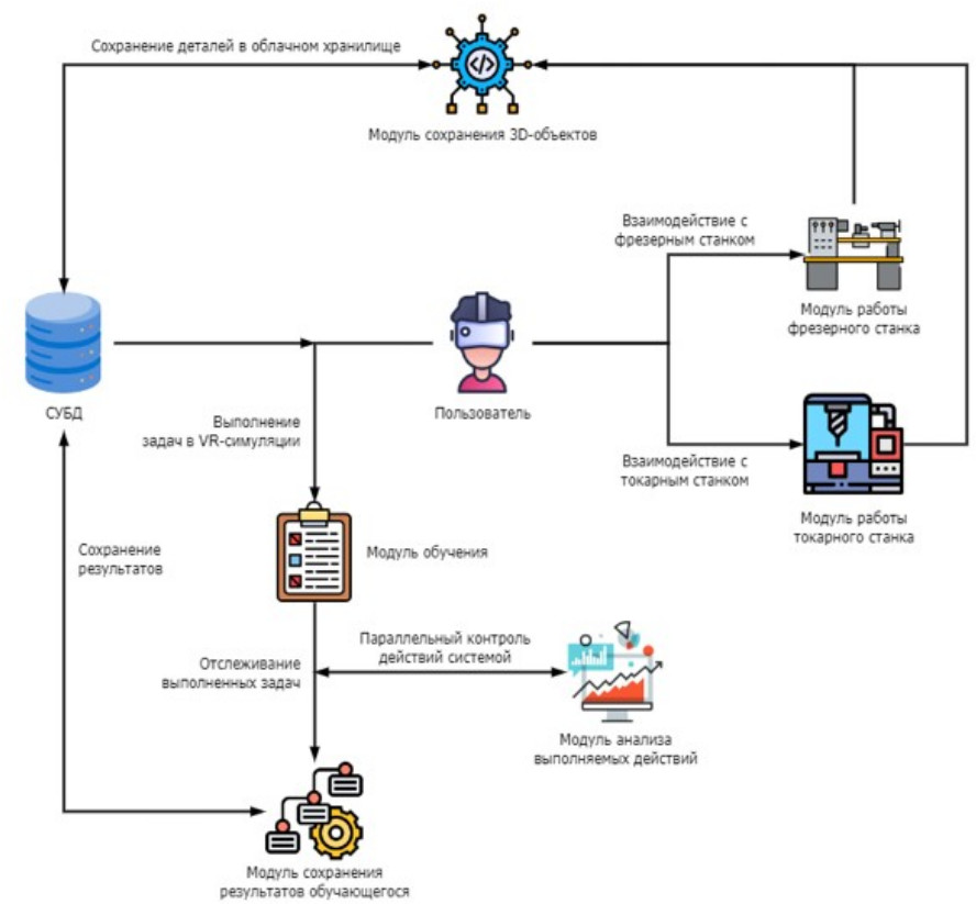 Пользователь имеет возможность выбрать режим работы на оборудовании (металлорежущие станки), например на токарных или фрезерных универсальных станках, или обратиться к режиму обучения. В зависимости от выбора включаются модули по сохранению 3D-объектов, модуль сохранения других результатов обучения, модуль анализа выполняемых действий. Информация хранится в базе данных (БД) и управляется системой управления базой данных (СУБД).