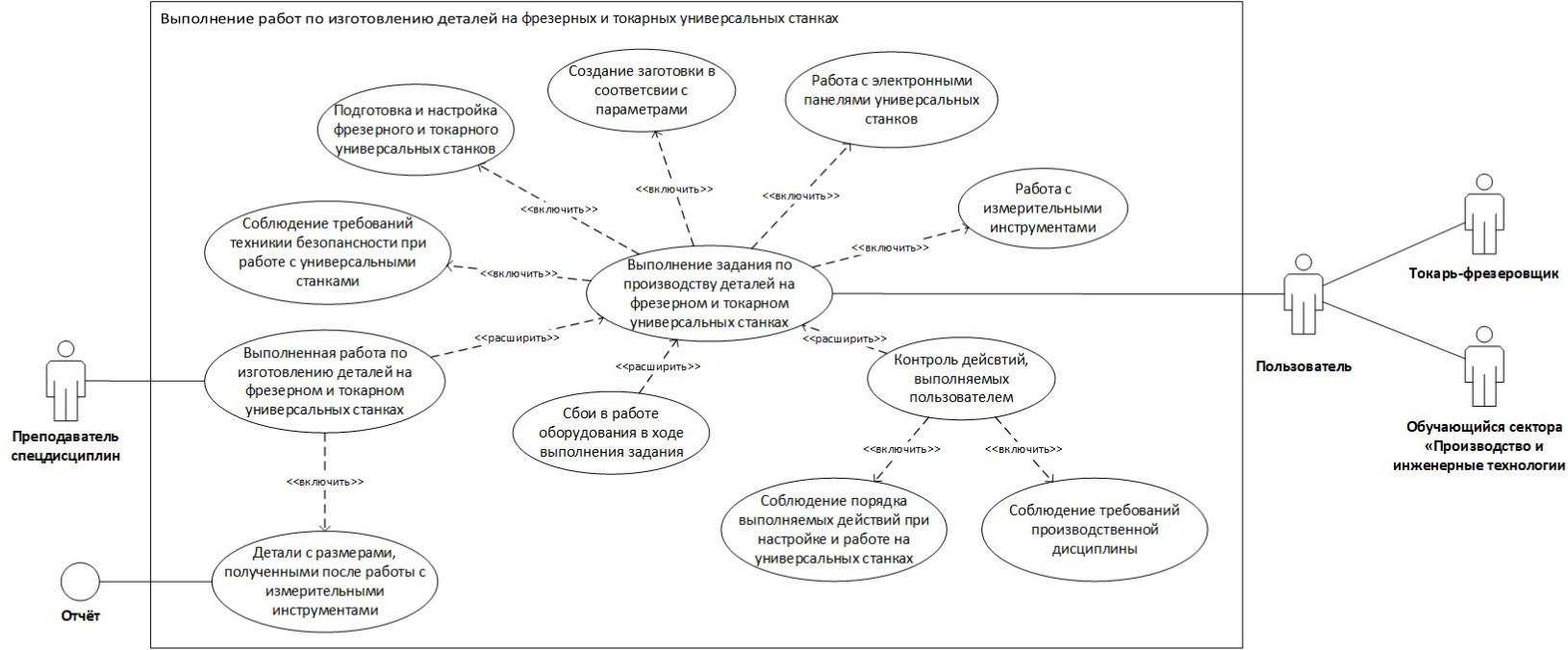 Функциональная часть виртуального тренажера по изготовлению деталей на универсальных металлорежущих станках – фрезерных и токарных – иллюстрируется на диаграмме прецедентов (рис. 4). Пользователь выполняет задания по производству деталей на универсальных станках: работает с измерительными инструментами, электронными панелями станков, имеет возможность создать заготовку в соответствии с заданными параметрами, а также заниматься наладкой и настройкой. Действия пользователя должны выполняться с соблюдением требований техники безопасности, охраны труда и производственной дисциплины. Контроль действий осуществляется разработанной системой VR по работе на универсальных металлорежущих станках – фрезерном и токарном, а также преподавателями, экспертами и наблюдателями. Данные о пользователе и результаты его работы сохраняются.