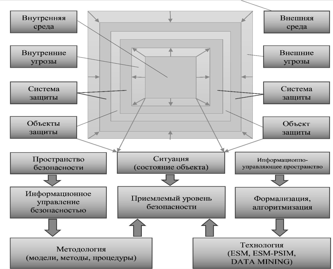 Организационная структура представляет собой целостную систему, состоящую из совокупности упорядоченных уровней управления, которая организует процесс коммуникации между ними с целью обеспечения приемлемого уровня безопасности в условиях взаимодействия с внешней и внутренней средой (рис. 3). Таким образом, обеспечение безопасности может быть квалифицировано как информационный менеджмент.