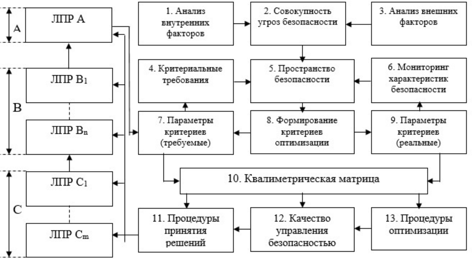 Корректировка параметров защиты возникает при появлении рассогласования между характеристиками организационной структуры (6) и критериальными требованиями (4), задаваемыми ЛПР. Иными словами, ЛПР задают требования к организационной структуре в форме критериев и их параметров (4, 7), мониторинг характеристик (6), выявляет реальные параметры (9) этих критериев, которые сопоставляются в квалиметрической матрице (10), где происходит преобразование указанных параметров в показатели качества и осуществляются процедуры квалиметрической оптимизации (13). Результат оптимизации используется в виде оценочных значений.