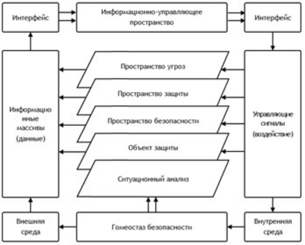 Указанные пространства формируют совокупность данных (информационные массивы), отражающих состояние объекта защиты с точки зрения безопасности. Вся информация поступает в информационно-управляющий центр (пространство), в котором после ситуационного анализа вырабатываются управляющие сигналы. Таким образом достигается определенная цикличность управления. Здесь как критерий оптимальности управления выступает гомеостаз безопасности [8].
