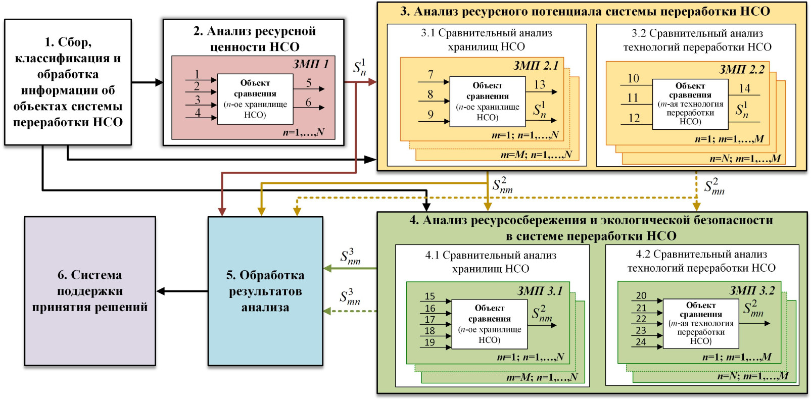 Основой рассматриваемого в статье алгоритма анализа объектов системы переработки НСО (рис. 1), включающего 6 последовательных этапов, является разработанная авторами методика последовательного решения взаимосвязанных задач многофакторного сравнения объектов по разнородным критериям качества, отличающихся новыми формулировками сопутствующих ЗМП. В качестве объектов сравнения рассматриваются хранилища НСО и технологии их переработки.
