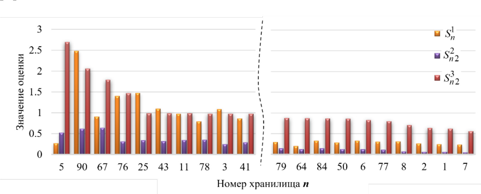 Анализ результатов расчета оценок, представленных на рис. 2, показал, например, что для хранилища № 90, имеющего максимальную ресурсную ценность в анализируемой системе переработки с оценкой , ресурсный потенциал имеет невысокое значение , но по оценке ресурсосбережения и экологической безопасности хранилище № 90 при переработке технологией № 2 занимает 2-е место в группе (см. рис. 2).