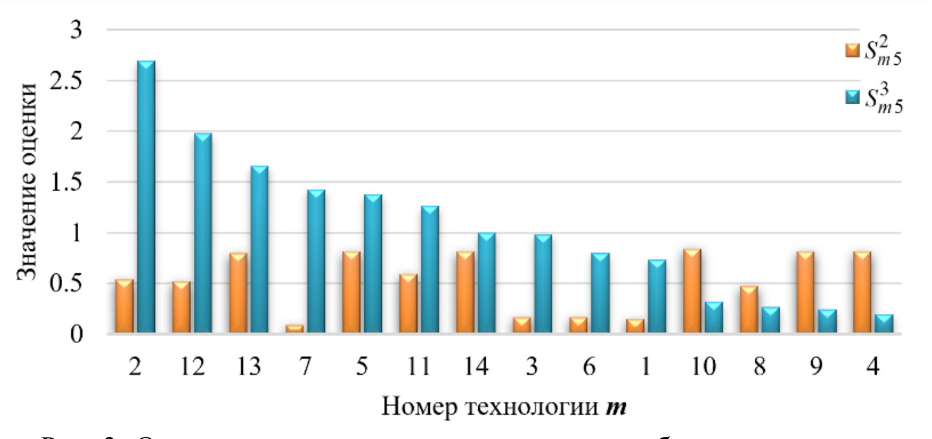 Результаты решения ЗМП 2.2 и 3.2 представлены на рис. 3 в виде оценок ресурсного потенциала и ранжированных комплексных многофакторных оценок ресурсосбережения и экологической безопасности различных технологий при переработке отходов в хранилище № 5. Выбор хранилища № 5 для демонстрации результатов расчетов связан с тем, что оценки в системе переработки, полученные по результатам решения всех ЗМП, входящих в алгоритм (см. рис. 1), являются максимальными для этого хранилища и технологий, применяемых для переработки НСО в нем ().