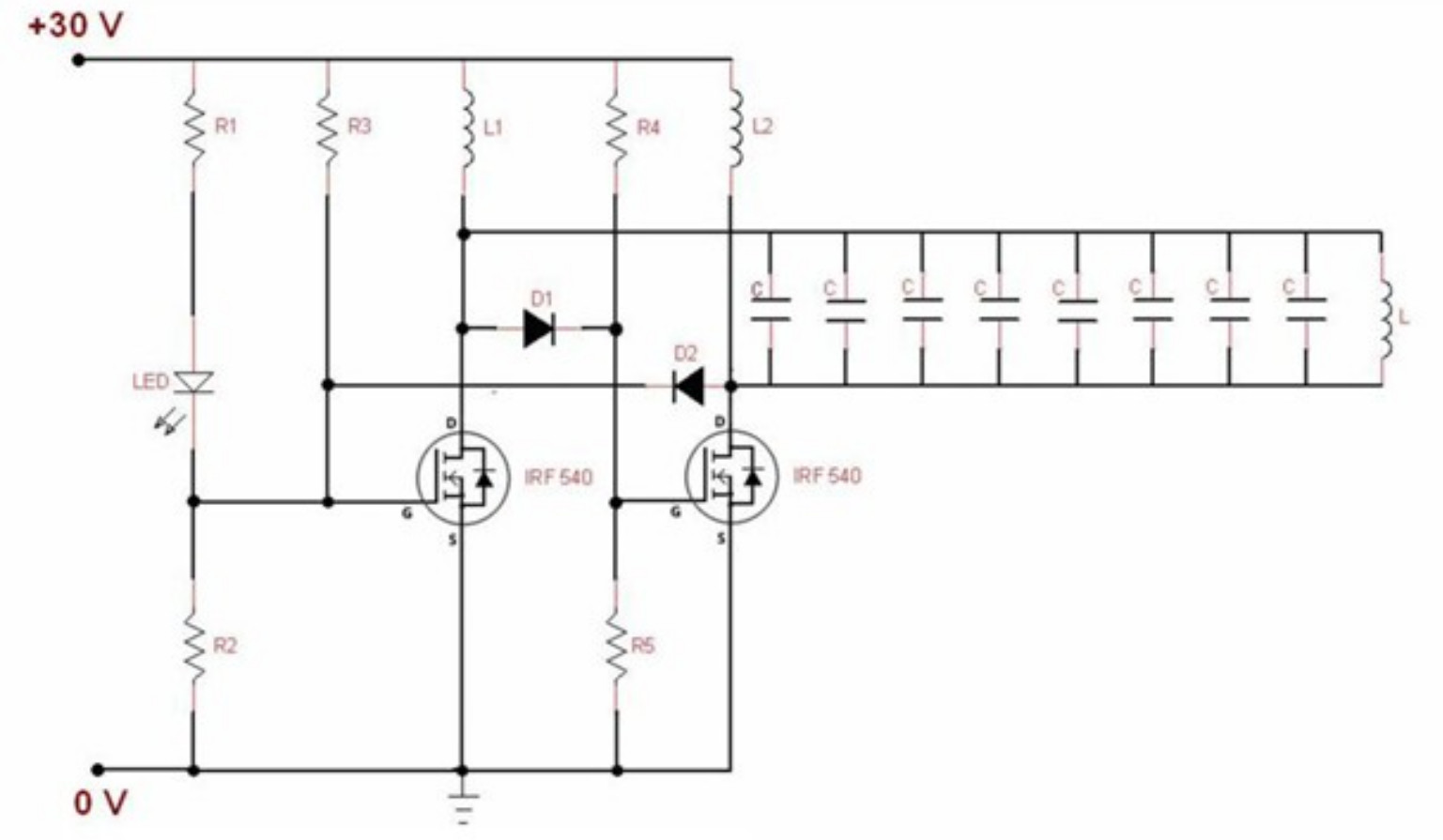 The transmitter circuit section has two power MOSFETs (IRF540) which are biased using the resistors R1, R2, R3, R4. There is also a choke made up of inductors L1 & L2. The 8 capacitors C operate as resonating capacitors to ensure the coils are at resonant frequencies. Oscillators have feedback, in the case of the royer oscillator negative feedback. The two diodes D1 & D2 thus provide the cross coupled feedback required. The transmitter coil L which is basically an inductor is where the electromagnetic induction occurs. The coil used in this case is gauge 26. When power is given to the oscillator circuit, the DC current starts flowing through the two sides of the coil (L1&L2) and also to the drain terminals of the MOSFET. During the same instant, voltage appears on gate terminal of both the transistors and tries to turn ON the transistors. Any one of the transistor will be faster than the other and it will turn ON first.