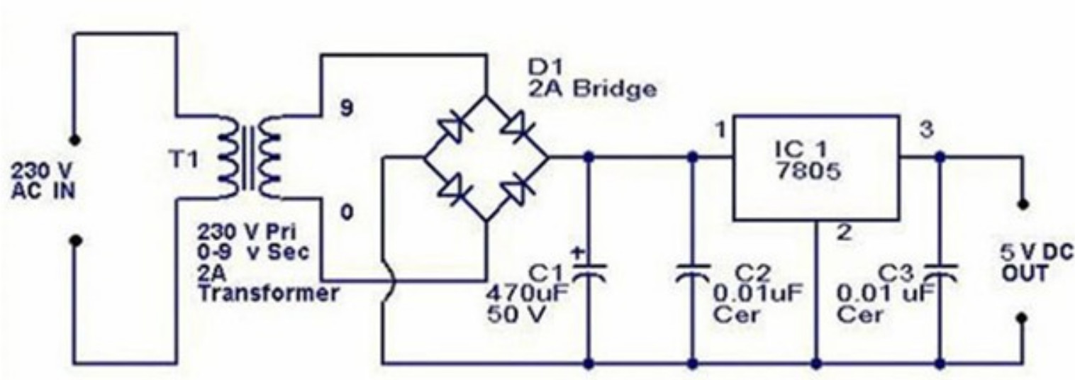 The bridge rectifier has an efficiency of 80% hence the rectified output is less than the input. The output received is 7.2V DC. This voltage however is still erratic and pulsating thus a smoothening capacitor is required. The smoothening capacitor supplies charge when the rectifier voltage falls thus evening out any fluctuations by the signal. The smoothened DC voltage is then fed to the voltage stabilizer LM7805 which ensures a stable output voltage of 5V.