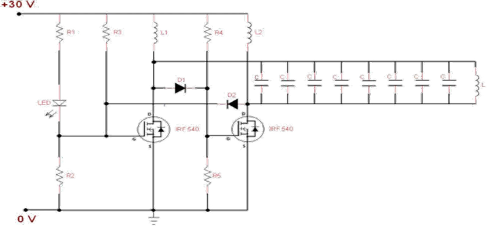 The transistor (MOSFET) causes a large current which is then supplied to the transmitting copper coil. The diagram in Fig. 2 shows the circuit of the transmitter section.