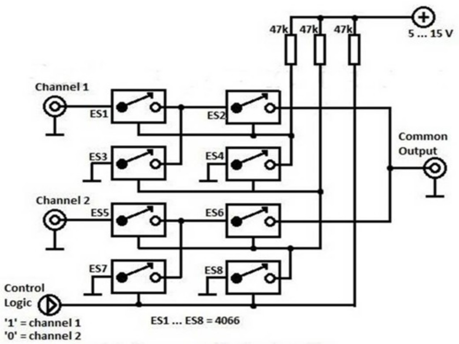 The CD 4066 is a low power multiplexing switch circuit which is an ideal replacement for mechanical switches. The IC has a bandwidth of around 8MHz, current consumption of 1 mA but it requires a high level power supply voltage since the input impedance of the circuit drops with higher voltage levels. The circuit cuts supply to the load once the batteries are full so that power is not lost unnecessarily. The multiplexer switch diagram is shown in Fig. 9.