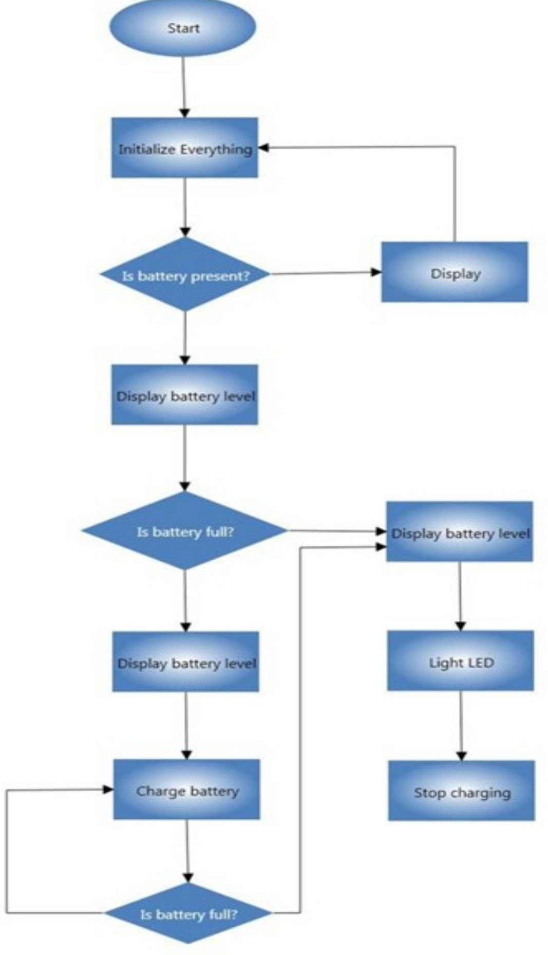 The system is required to alert the user if a load is in place, calculate and display the level of charge, start the charging if needed and finally cut the charging when the load is fully charged. To do these actions on its own, the microcontroller needs to be loaded with a program to enable it execute all these actions.