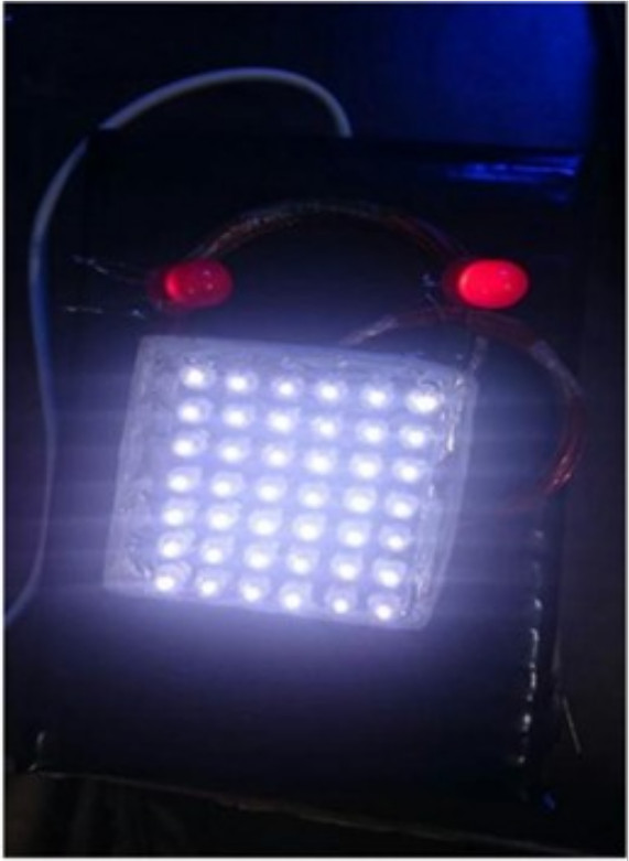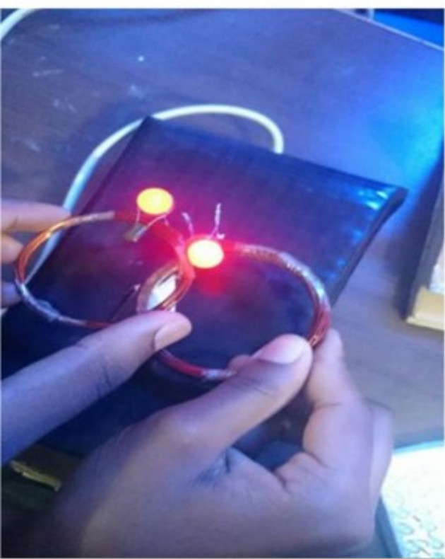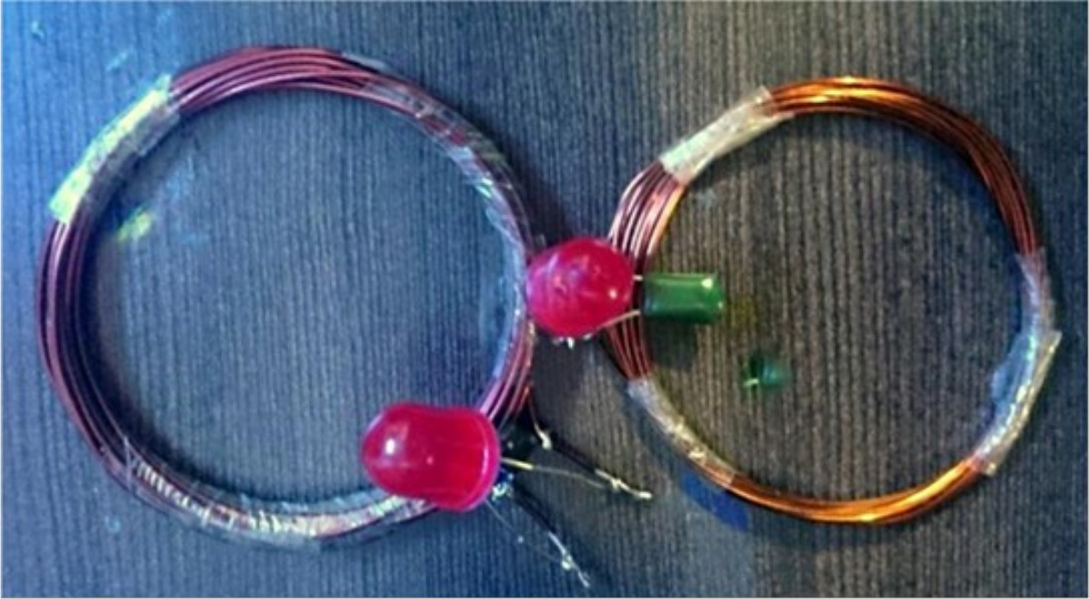 To test if power is transmitted, we first solder an LED to the receiver coil. The test is successful with only 5V DC powering the oscillator. However, the power is too to energize the battery charging circuit that comprised of an LCD and microprocessor. The voltage is stepped up using a boost converter to 30V DC. Two receiving coils are used and each has an LED lamp. They both lit brightly. We then add a set of LEDs and the results are as in Fig. 14 and Fig. 15.
