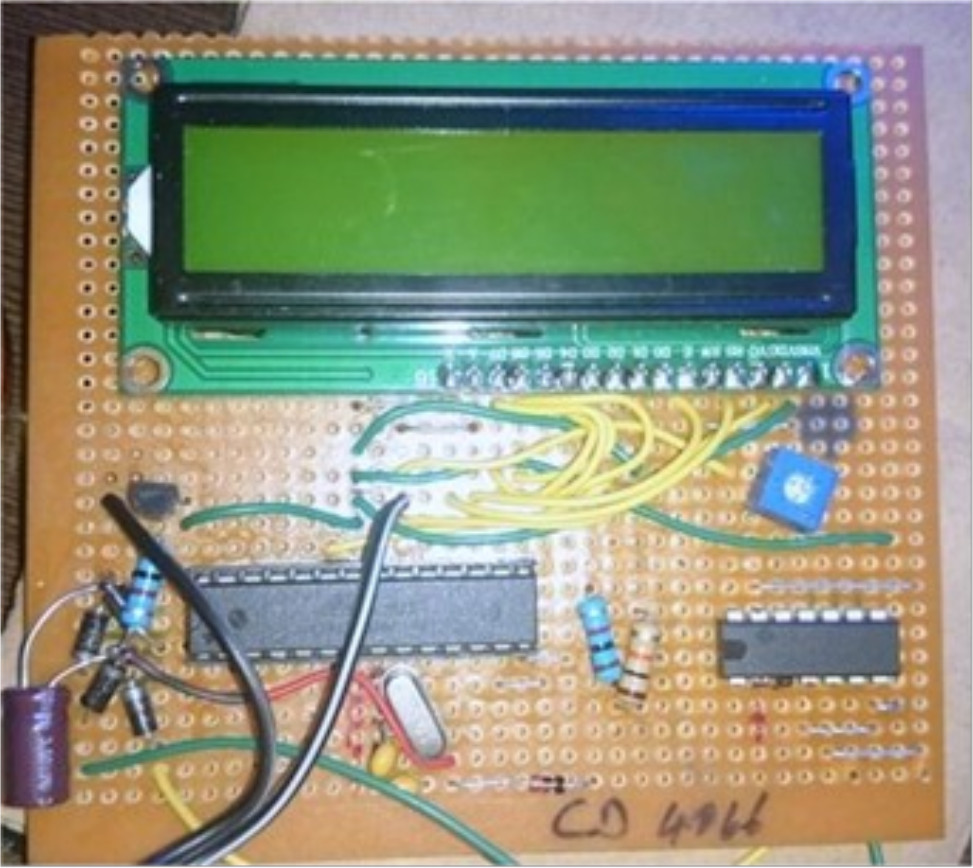In this paper, a display screen is used to show various aspects of the work. Internally, the LCD is made up of a thin layer of liquid crystals sandwiched between two layers of transparent electrode glass sheets. The nature of the glass sheets determines the type of the LCD screen. If both glass sheets are transparent then the LCD is transmissive and if one sheet has a reflective coat then the cell will be reflective. The liquid crystal molecules are able to twist, therefore changing slightly the amount of light penetration resulting in different characters being displayed on the screen. The display unit for this paper is a 16X2 LCD as shown in Fig. 7.