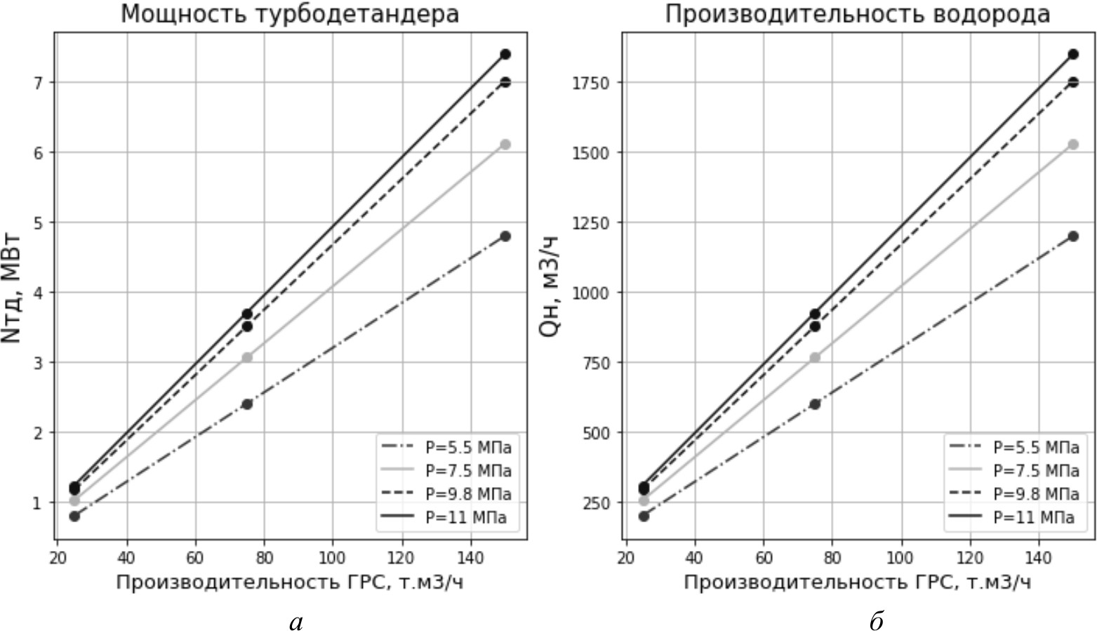 Задачей работы являлось оценить энергетический потенциал регенеративной ЭГТДУ для получения водорода в ПОГУ. Используя типовые параметры природного газа современных магистральных газопроводов (Бавоненково – Ухта, «Сила Сибири» и др.), задались диапазоном изменения давления на входе в турбодетандер (с учетом гидравлических потерь) от 10 до 5 МПа. По производительности ГРС разделены на три группы: малой производительности при т.м3/час, средней производительности при т.м3/час, большой производительности при т.м3/час.