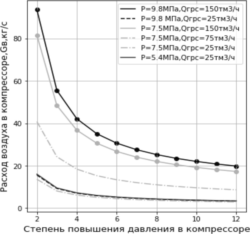 По результатам расчета на графике рис. 3 построена зависимость изменения расхода воздуха в ЭГТДУ. С уменьшением производительности ГРС и увеличением степени повышения давления в компрессоре расход воздуха снижается.