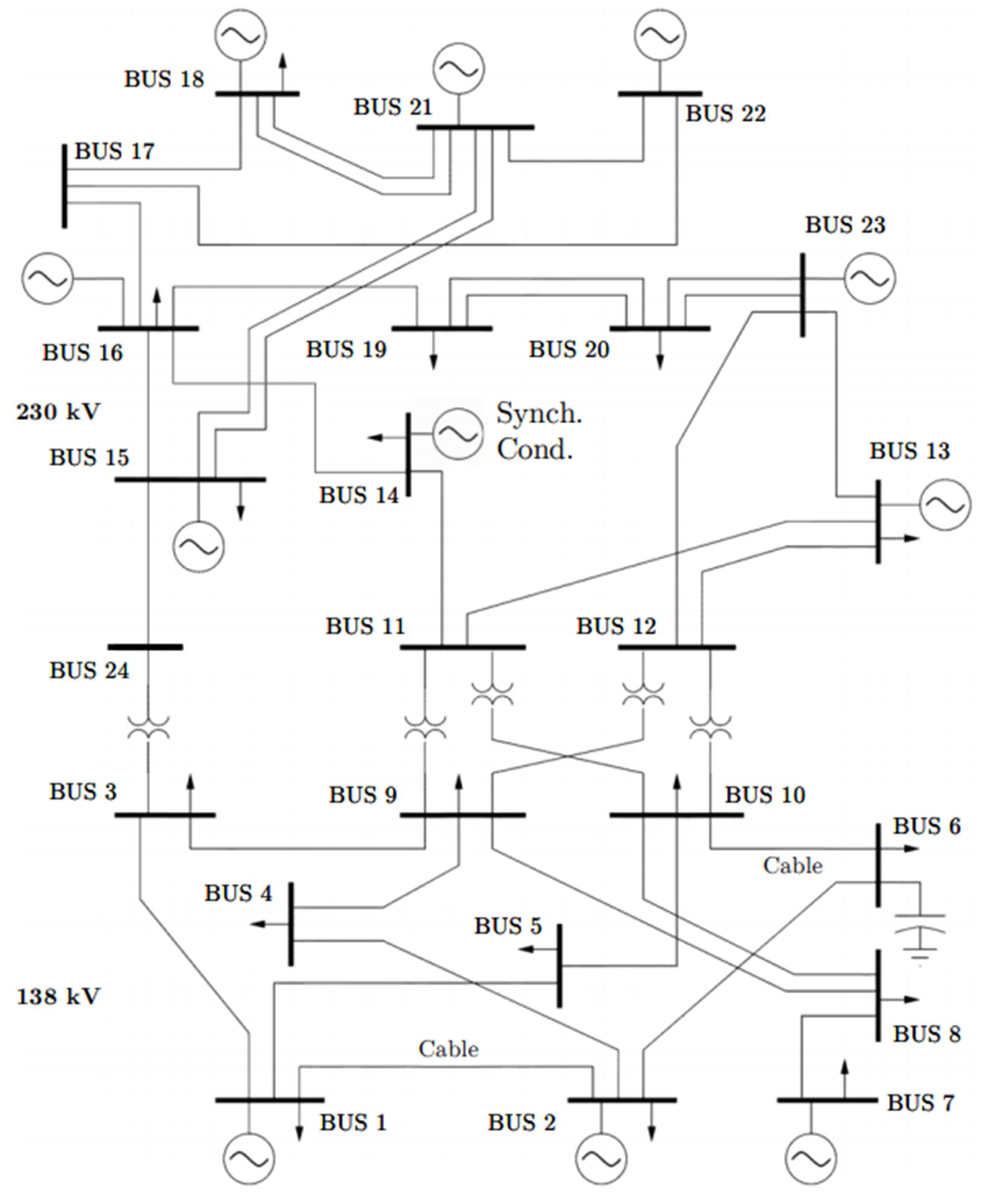 В представленной работе в качестве тестовой модели используется сдвоенная тестовая схема (TS1) IEEE RTS [26]. Подробное описание данной модели, перечень генераторов, подлежащих ремонту, а также результаты планирования, полученные с помощью метода дифференциальной эволюции, приводятся в работе [9]. На рис. 1 представлена схема данной тестовой модели.
