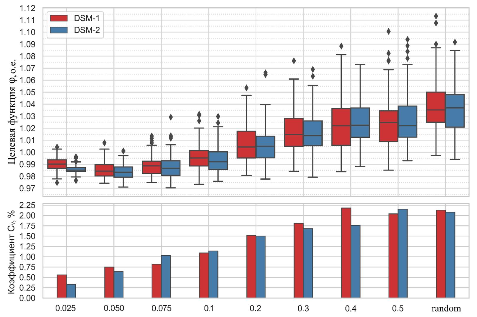 Рис. 2. Коробчатые диаграммы целевой функции и коэффициенты вариации для двух подходов к инициализации расчета: традиционного (random) и предлагаемого , и для методов инициализации: направленного поиска 1-го (DSM-1) и 2-го (DSM-2) порядков