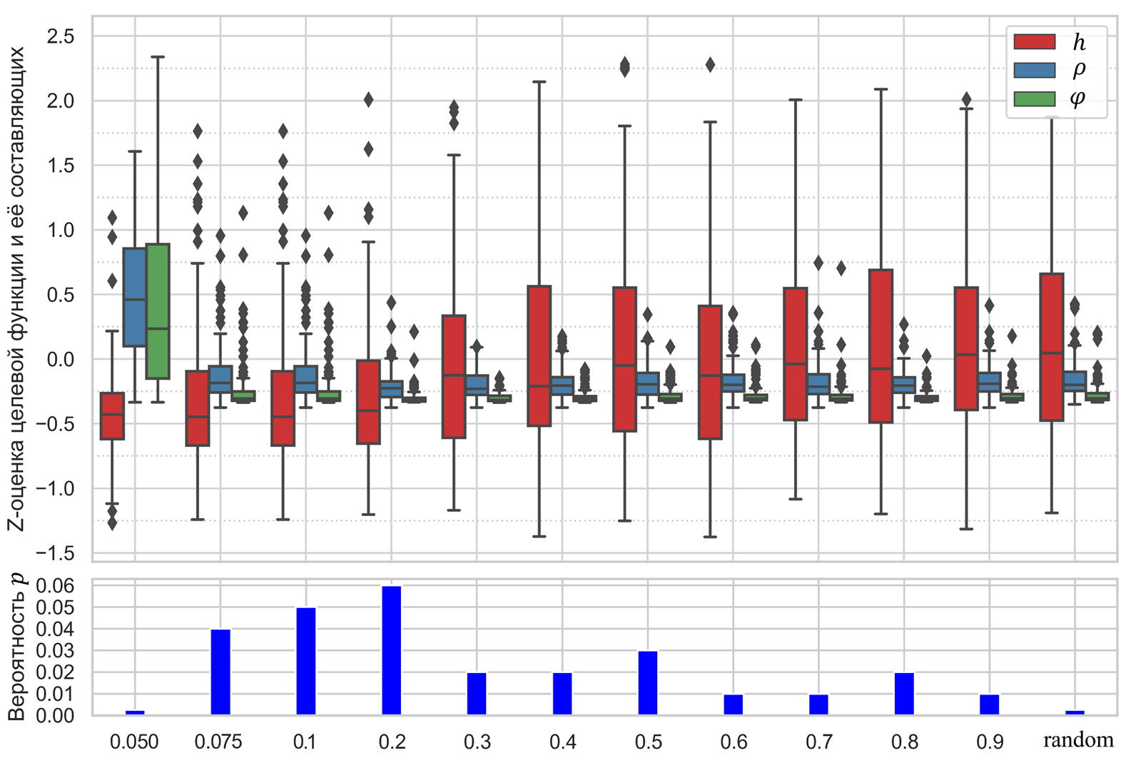 Рис. 3. Коробчатые диаграммы z-оценок целевой функции и ее составляющих h и для предлагаемого и традиционного (random) подходов с учетом ограничений; гистограмма вероятности p получения решения, удовлетворяющего всем ограничениям