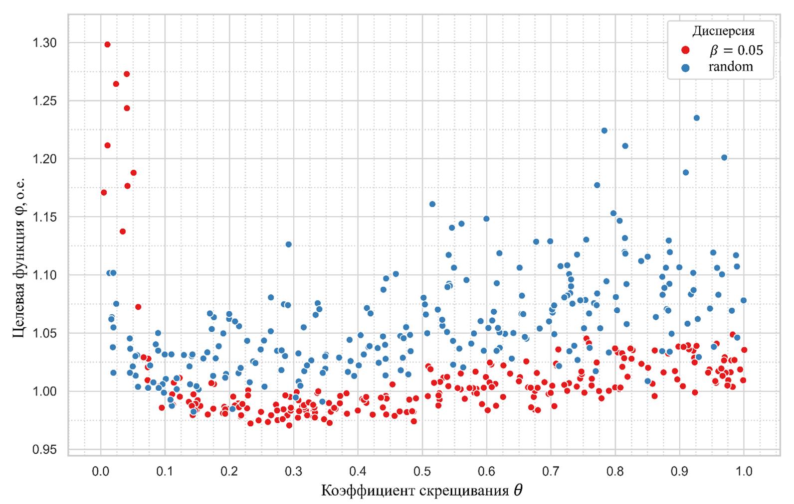Рис. 4. Диаграммы рассеяния целевой функции относительно коэффициента скрещения для двух подходов к инициализации расчета: традиционного (random) и предлагаемого ()
