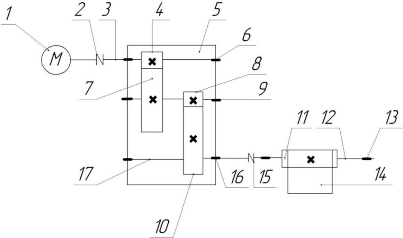 Рис. 1. Кинематическая схема конвейера: 1 – электродвигатель; 2 – муфта упругая; 3 – вал быстроходный; 4 – вал-шестерня быстроходной ступени; 5 – корпус редуктора; 6 – подшипниковый узел с глухой крышкой; 7 – зубчатое колесо быстроходной ступени; 8 – вал-шестерня тихоходной ступени; 9 – вал-шестерня промежуточный; 10 – зубчатое колесо тихоходной ступени; 11 – барабан приводной ленточного конвейера; 12 – вал приводного барабана; 13 – опора подшипниковая приводного барабана; 14 – лента питателя; 15 – муфта упругая; 16 – подшипниковый узел со сквозной крышкой с уплотнением; 17 – вал тихоходный