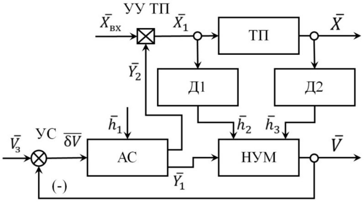 Для проведения следующего этапа исследований разработана структурная схема системы автоматического управления (САУ) диагностики надежности электроприводов (рис. 5). Здесь блок моделирует технологический процесс (ТП) в рассматриваемом случае, процесс работы электропривода конвейера [3], входные координаты которого контролируется датчиками Д1, а выходные – датчиками Д2. Кроме того, координата формируется из координаты , обеспечивая дискретное управление ей посредством сигнала . Параметры надежности устройств, участвующих в технологическом процессе, моделируются с помощью блока «Надежность узлов машин» (НУМ). В этом блоке реализованы все функции надежности узлов, объектов, устройств и машин технологического процесса. Выходной координатой НУМ являются параметры надежности узлов, учитываемыми в процессе работы возмущениями – сигналы и с датчиков Д1 и Д2. Входным воздействием на НУМ является – это операции технического осмотра, обслуживания и ремонта, которые позволят привести показатели надежности машин технологического процесса к заданным в технической документации значениям (пределам). Сигналы и формируются административной системой АС, в которую входят логические и вероятностные функции, обеспечивающие проведение своевременных процедур по восстановлению надежности устройств технологического процесса с учетом ряда производственных факторов . Работа АС основывается на сигнале отклонения , который является разностью заданных в технической документации значений и полученных с НУМ параметров надежности [13].
