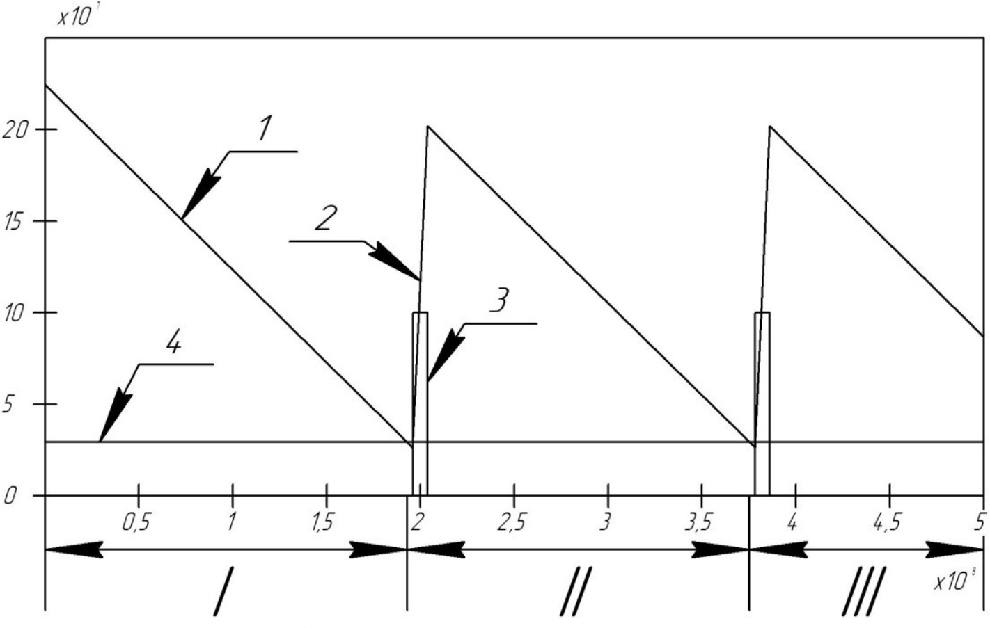 Работу построенной вычислительной модели оценим по графику изменения времени наработки до отказа, приведенному на рис. 7. На графике видно, что наработка (линия 1 периода I) уменьшается с течением времени и при достижении минимального уровня надежности (линия 4) должен начаться процесс восстановления объекта. Но в этот момент времени производить восстановление объекта не представляется возможным по причинам, описанным ранее в общих принципах действия АС. В случае, когда ситуация позволяет, происходит восстановление объекта, которому соответствует растущая линия 2 на рис. 7. При этом восстановление объекта происходит до начального уровня наработки. Также на графике показан период восстановления асинхронного двигателя (линия 3 на рис. 7), в котором объект выведен из работы и происходит восстановление его показателя надежности. На периодах II и III процессы повторяются.