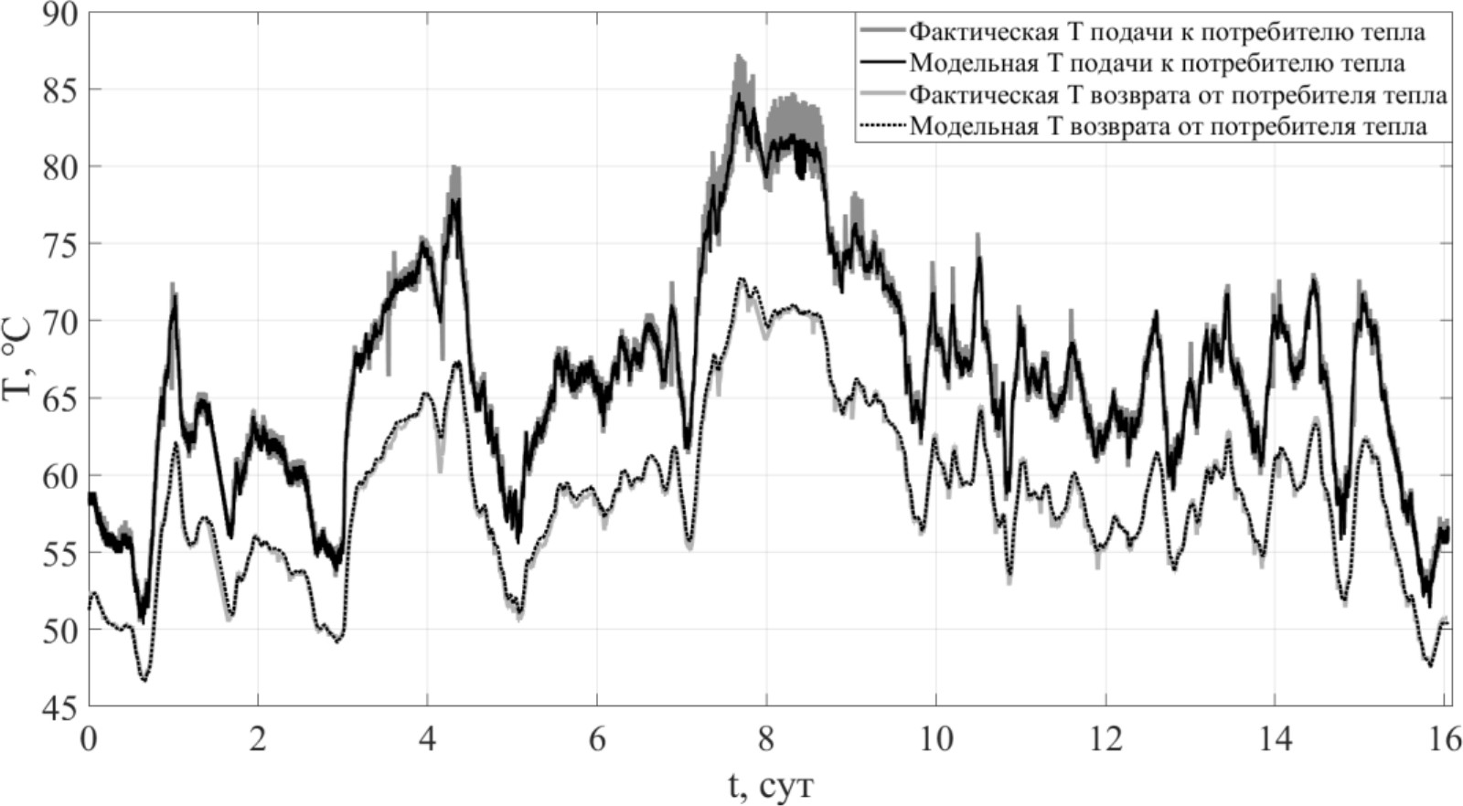 На графиках (см. рис. 5, 6) наблюдаются кратковременные расхождения (выбросы) между поведением реальной системы и модели, которые могут быть объяснены в первую очередь недостаточной точностью моделирования потребления в контуре ГВС: увеличение потребления в утренние и вечерние часы. Разработка более точной модели потребления ГВС имеет смысл только для решения задачи оптимизации локальной автоматической системы поддержания температуры подачи теплоносителя в контуре ГВС и в данной работе не рассматривалась.