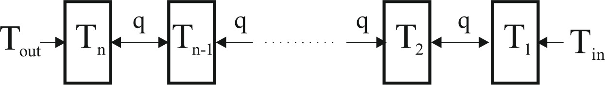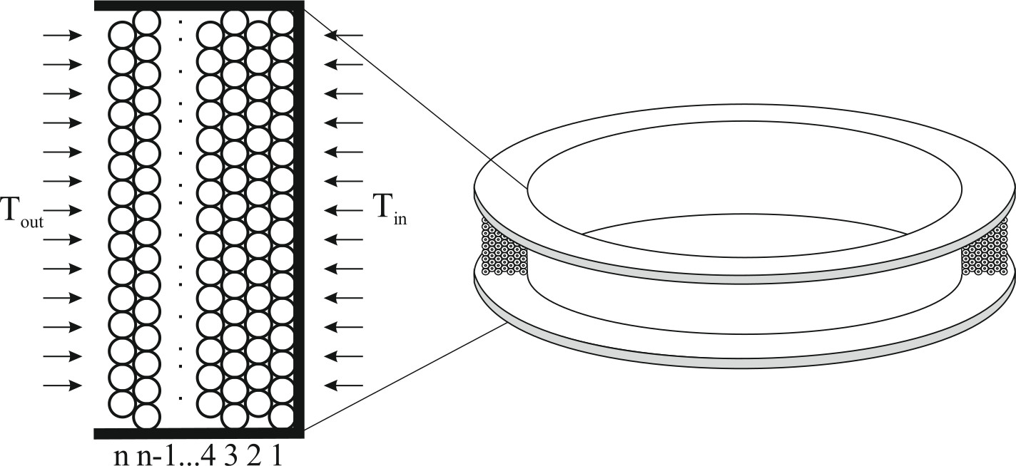 Рассчитаем температуры в каждом слое волоконной бухты, используя метод балансов [9]. Для этого представим массив волокна в виде n слоев, каждый из которых является отдельным «элементарным объемом» с одинаковыми теплофизическими параметрами – массой, теплоемкостью и эквивалентной термопроводимостью (рис. 3).