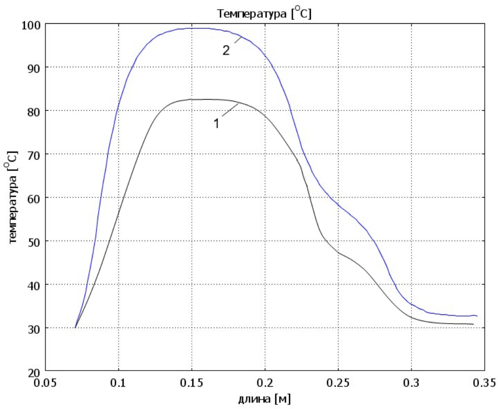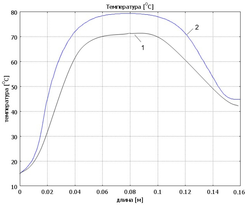 Рис. 2. Диаграммы температуры по длине подвижного ножа заземлителя в момент времени 3 с: 1 - при постоянной мощности тепловыделения; 2 - при возрастающей мощности тепловыделения