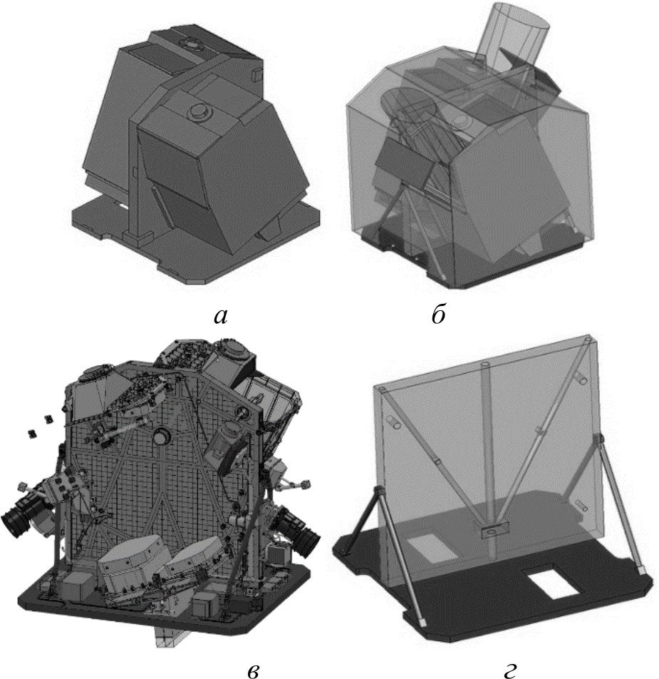 Рис. 1. Общий вид отсека космического аппарата: а – отсек в сборе; б – размещение аппаратуры в КА; в – размещение ИИС на НК; г – НК в сборе