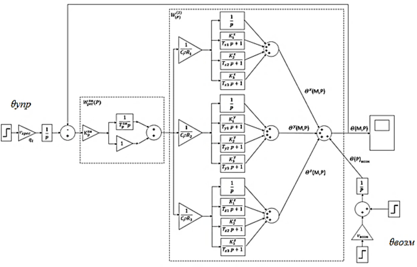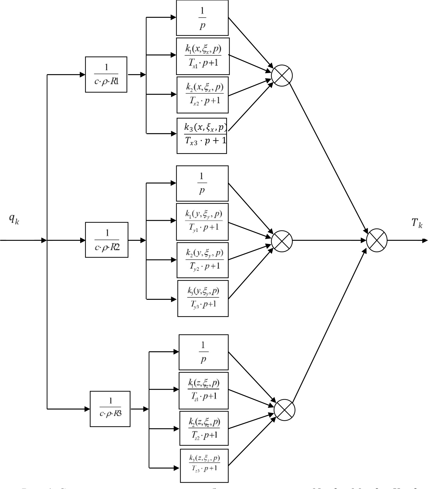 Тогда с учетом (5) рассматриваемый объект управления с распределенными параметрами допускает структурное представление по каждой координате x, y, z в виде параллельного соединения интегрирующего звена и бесконечного числа типовых апериодических звеньев и для любых двух точек N (x, y, z) и имеет передаточную функцию , если рассматривать все компоненты , кроме и , в качестве неконтролируемых возмущений [13–15, 17, 18]: