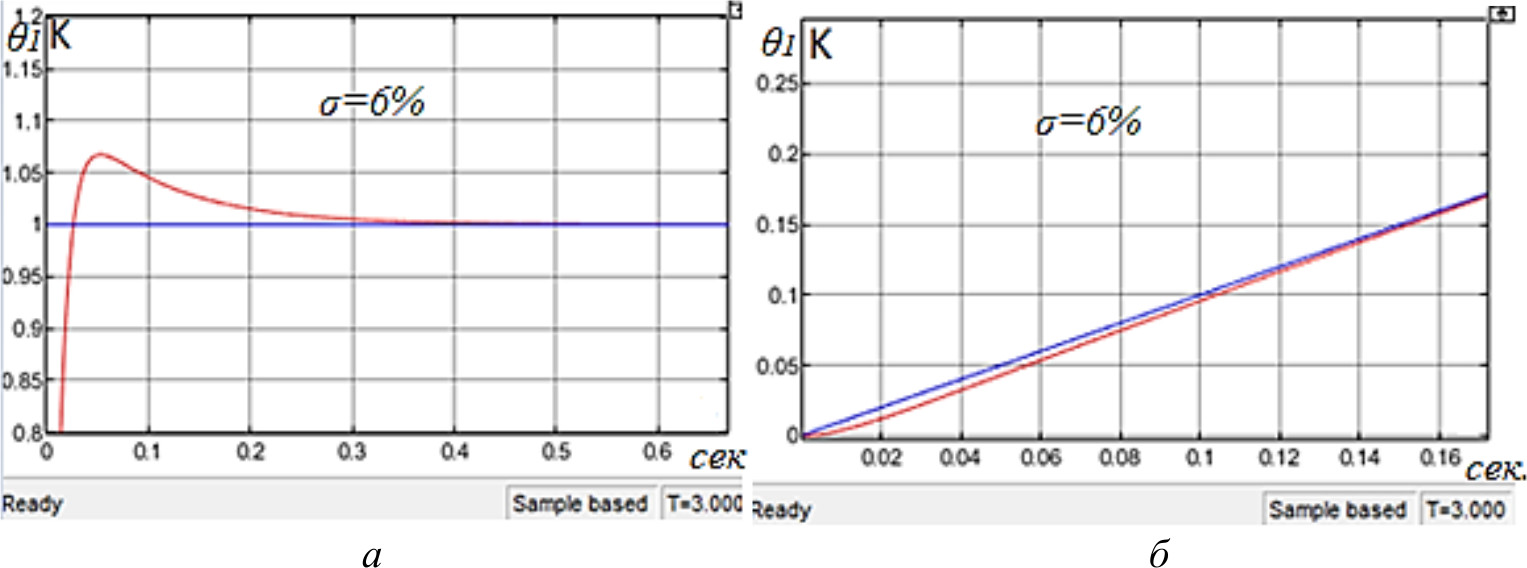 На рис. 6 представлены результаты моделирования переходного процесса в САУ по возмущению: а) при единичном ступенчатом входном сигнале УИТ ; б) при линейно нарастающем сигнале УИТ со скоростью К/с.