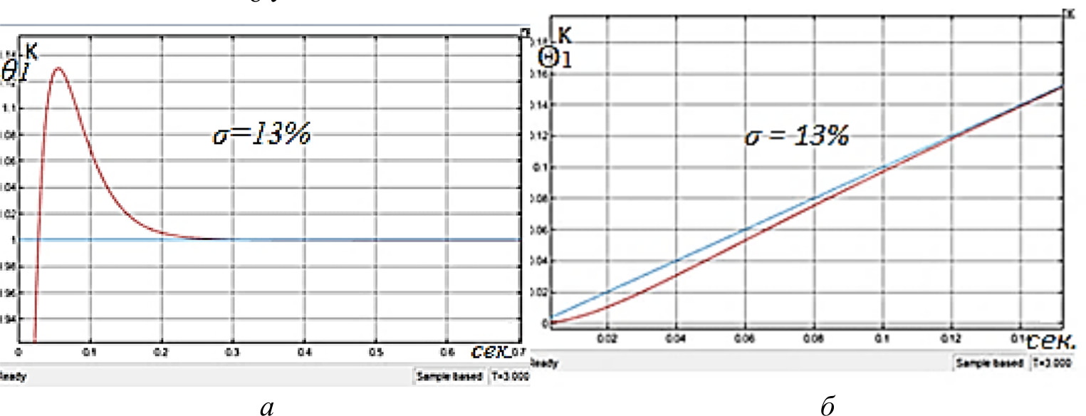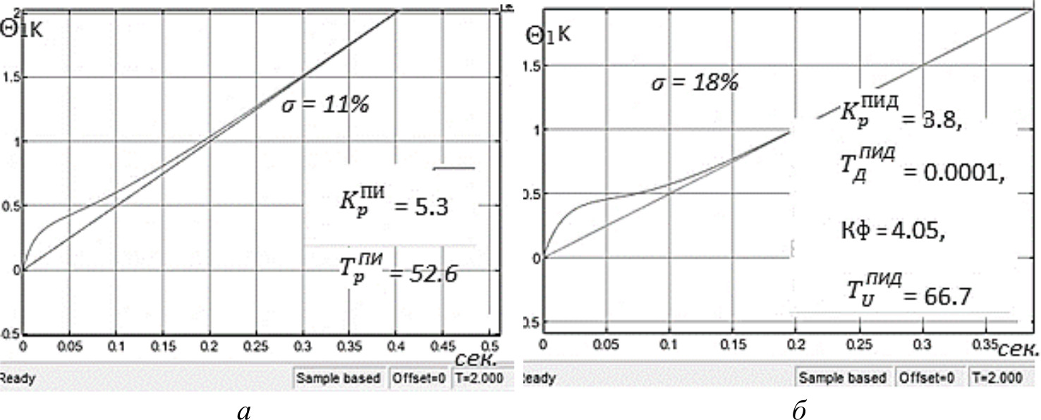 Рис. 8. Реакции САУ на возмущение с увеличенной скоростью сигнала управления до 2K/c: а – реакция САУ на возмущение с ПИ-регулятором; б – реакция САУ на возмущение с ПИД-регулятором