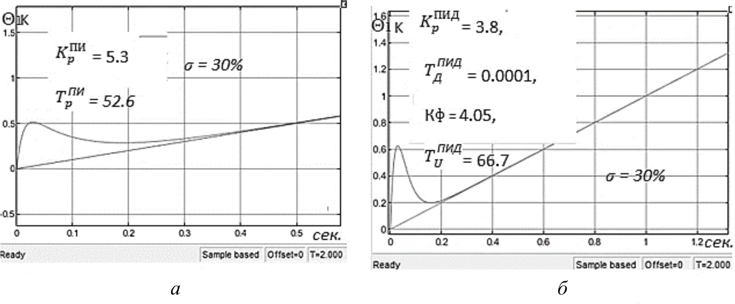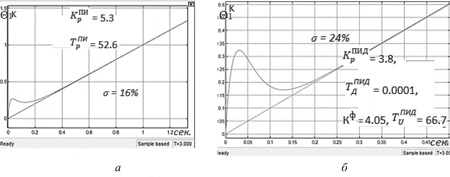Рис. 9. Реакция на возмущение: а – САУ с ПИ-регулятором; б – САУ с ПИД-регулятором