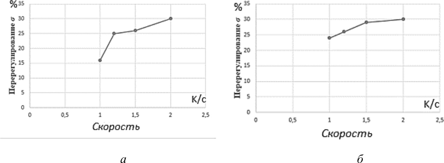 Рис. 11. Зависимость перерегулирования σ от скорости изменения сигнала возмущения : а – САУ с ПИ-регулятором; б – САУ с ПИД-регулятором
